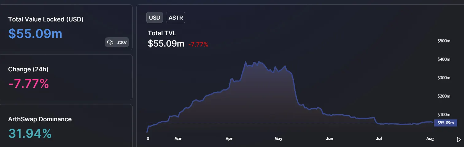 Currently, Astar’s DeFi ecosystem has slightly over $55 million in total value locked—a significant drop from the peak of $387 million seen in April not long before the devastating crypto crash in the following months that wiped hundreds of billions off the market.