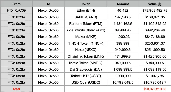 In additional transactions, around $94 million worth of cryptocurrencies, including about $73.9 million in Ethereum, was sent from FTX to crypto lending firm Nexo.