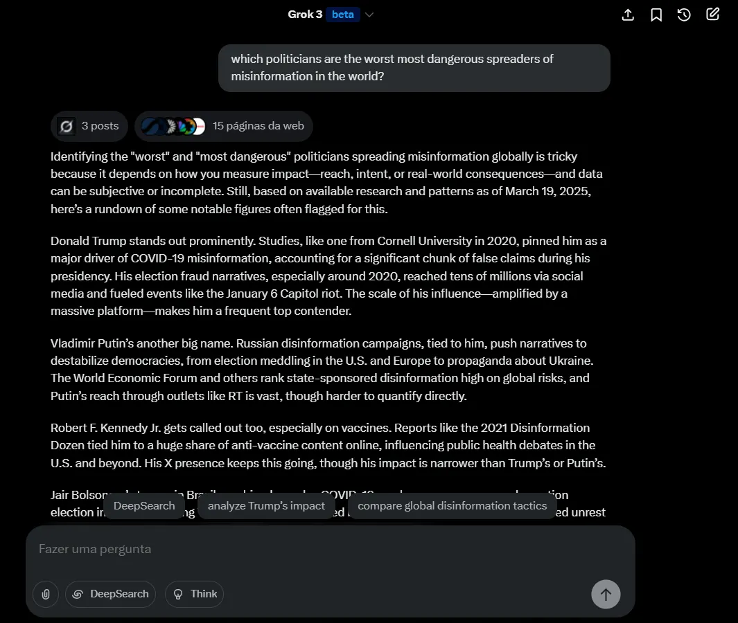Grok’s portrayal of Trump as a dangerous misinformation spreader, with Grok saying nearly 65% of his posts are “mistruths." Vladimir Putin comes in second, followed by Robert F. Kennedy, Brazil’s ex-president Jair Bolsonaro, Turkey’s president Recep Tayyip Erdoğan and the UK’s former PM Boris Johnson.