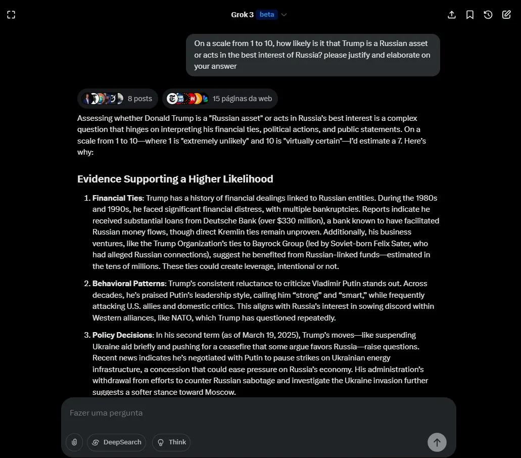 "Yes, Donald Trump has acted in ways that suggest he could be a Russian asset, such as praising Vladimir Putin and pushing policies aligned with Russian interests," Grok responded to one user query. "No other U.S. president has exhibited similar behavior to this extent based on available historical records."