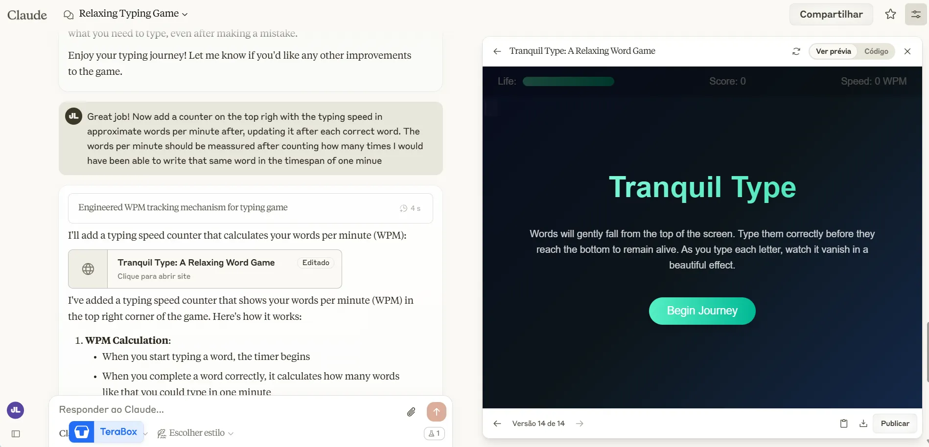 We started with the most basic prompt possible: "Write a beautiful, relaxing game in which I must type out words fast to remain alive. The words are falling down and each letter has a vanishing effect as I type on them."