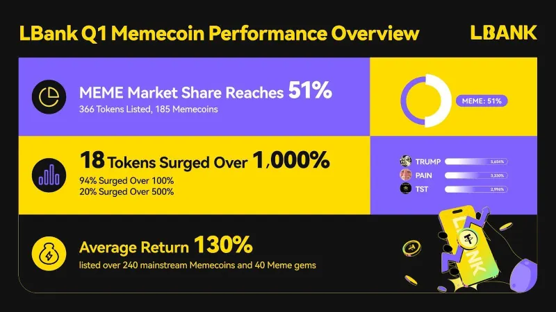 In Q1 2025, LBank accelerated its rapid-listing strategy, adding 366 high-potential assets across memecoins, Layer 2, and DeFi sectors. Notably, about 51% of these listings were memecoins, with many achieving returns exceeding 10x. LBank’s dominance in the memecoin sector was further recognized by crypto media outlet CoinGape, which named it the “Top Choice for Meme Investment.”