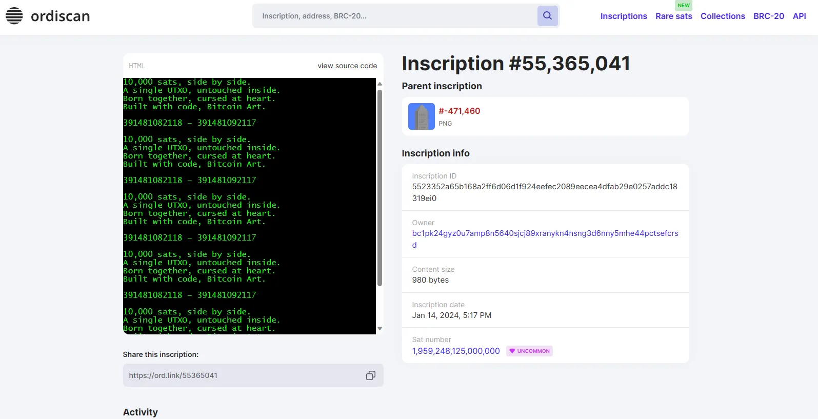 "10.000 sats, uno al lado del otro", dice el mensaje encontrado en la inscripción 55.365.041 de Ordinals. "Un solo UTXO, intacto en su interior. Nacidos juntos, malditos de corazón. Construidos con código, Arte de Bitcoin". El mensaje fue seguido por una serie de números 391481082118 - 391481092117.