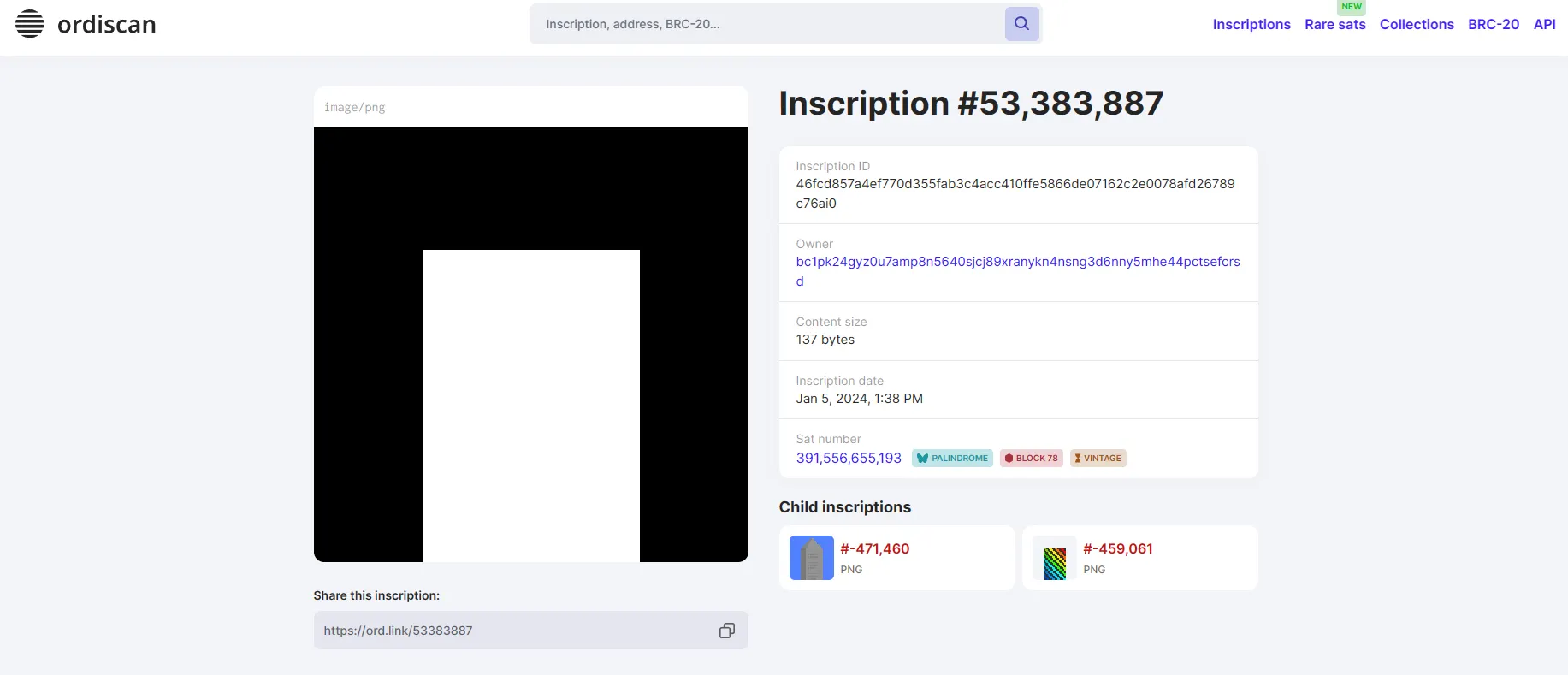 El llamado "ordinal maldito" estaba vinculado a otra inscripción principal, 53.383.387, que mostraba una puerta blanca bajo un arco negro.