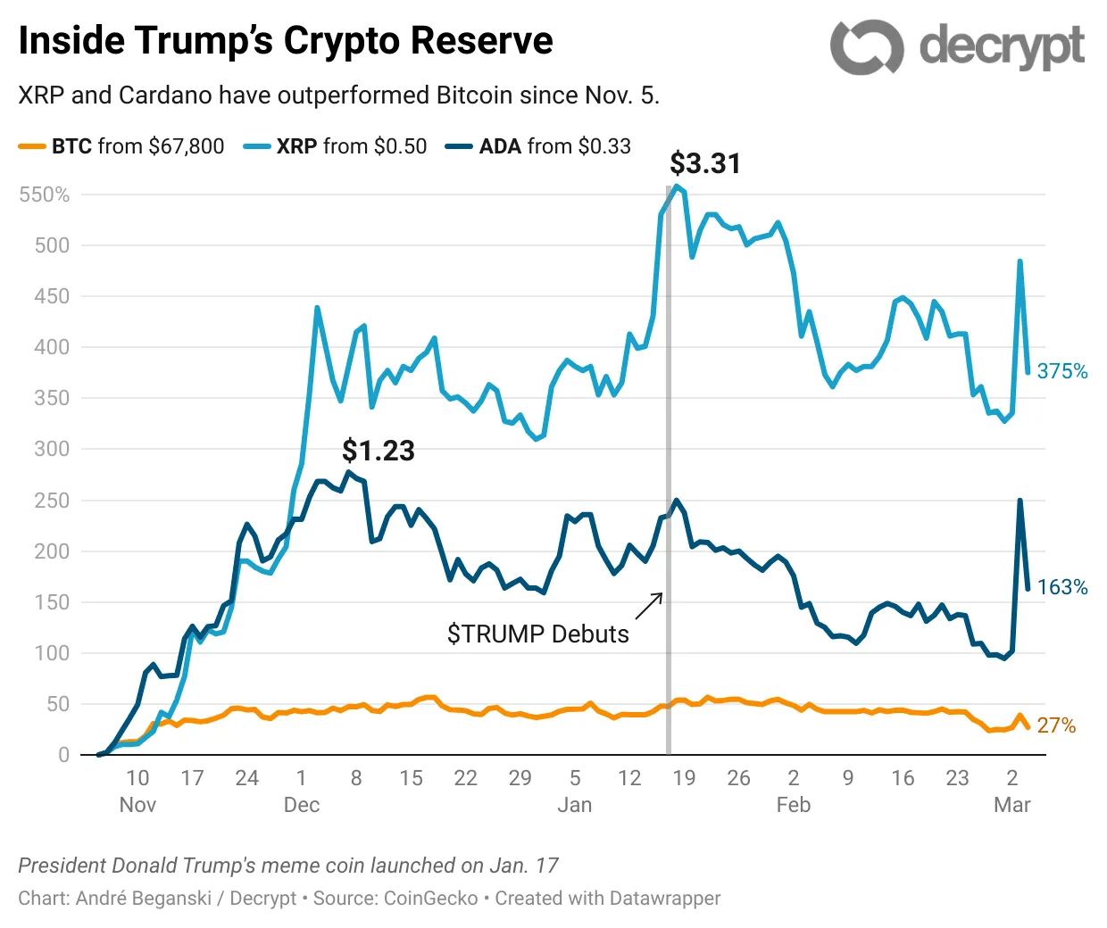 Dos de los activos digitales propuestos para la reserva de criptomonedas del presidente de EE. UU. Donald Trump, XRP y Cardano aumentaron recientemente un 375% y un 163% luego de las elecciones, mientras que Bitcoin ha cedido una buena parte de sus ganancias y Ethereum y Solana han caído precipitadamente.
