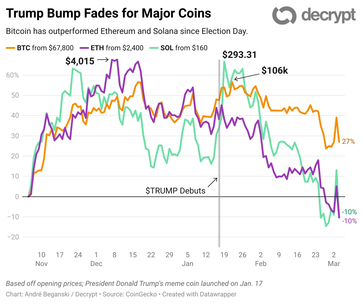 Solana recientemente se estaba negociando alrededor de $145, cayendo un 9,3% desde el 5 de noviembre, y muy lejos de su máximo histórico de $293 establecido después de que Trump debutara su propia moneda meme en enero. Ethereum ha caído un 9,5% desde el Día de las Elecciones.