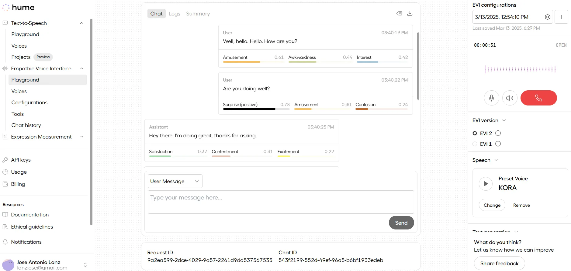 Hume AI mantiene con éxito el flujo conversacional mientras reconoce tus pensamientos con calidez. Sin embargo, se siente como hablar con alguien que no está realmente interesado en ti. Sus respuestas fueron mucho más cortas que las de Sesame—eran relevantes pero poco interesantes si querías impulsar la conversación.