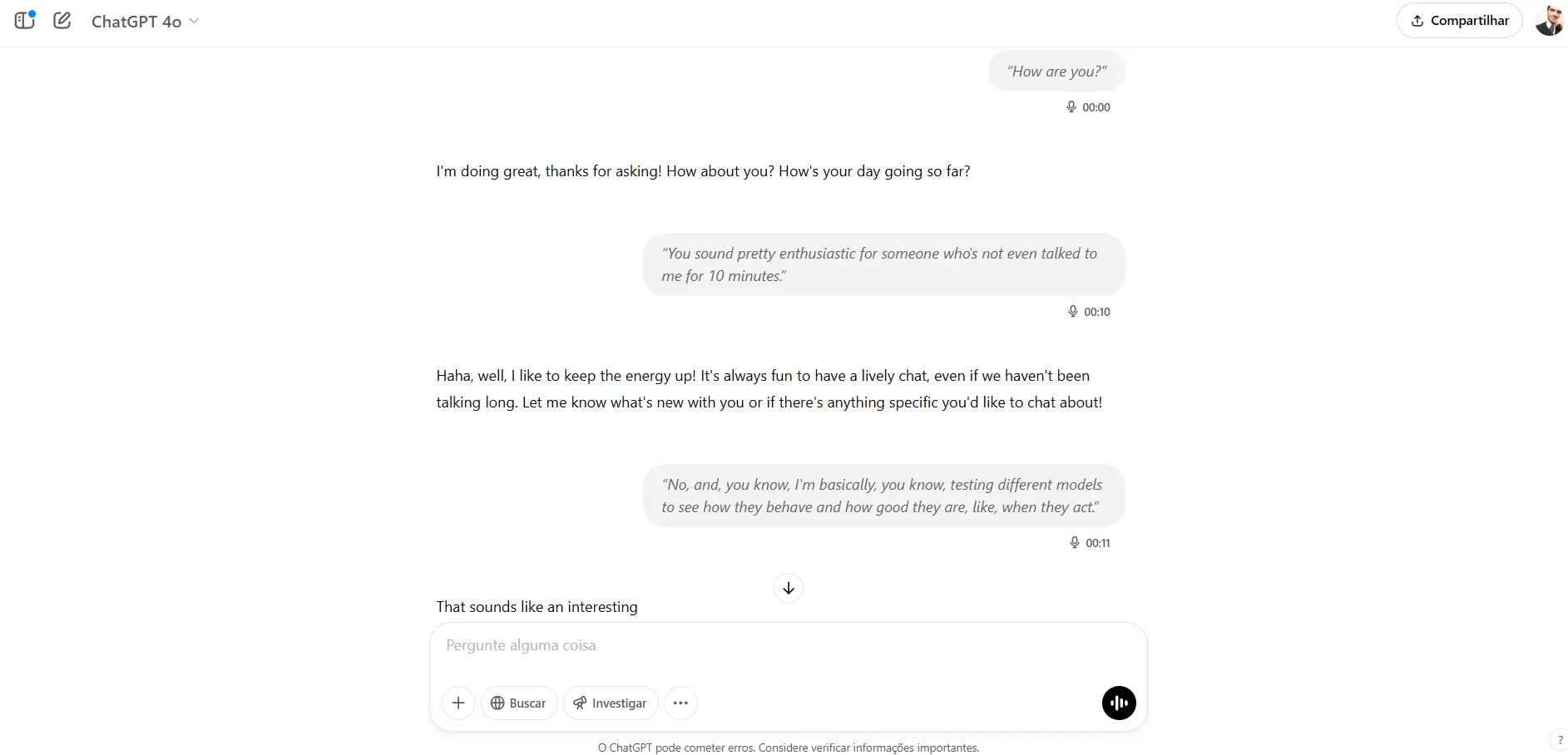 Incluso durante discusiones personales, no puede evitar sonar académico: "la interacción de la biología, la química y la conciencia crea una profundidad que el reconocimiento de patrones de la IA no puede replicar", dijo en una de nuestras pruebas. Casi cada respuesta comienza con "esa es una perspectiva fascinante"—un tic verbal que rápidamente se vuelve notable, y un problema común que mostraron todas las otras IA excepto Sesame.