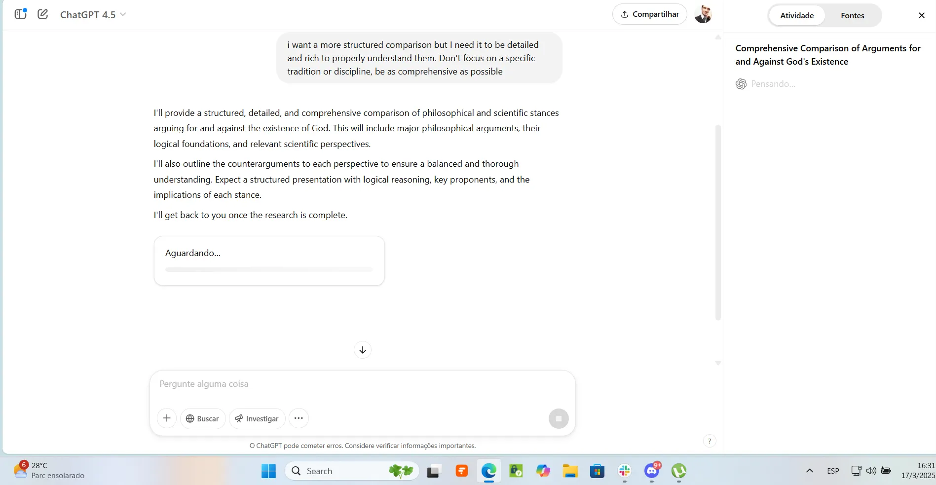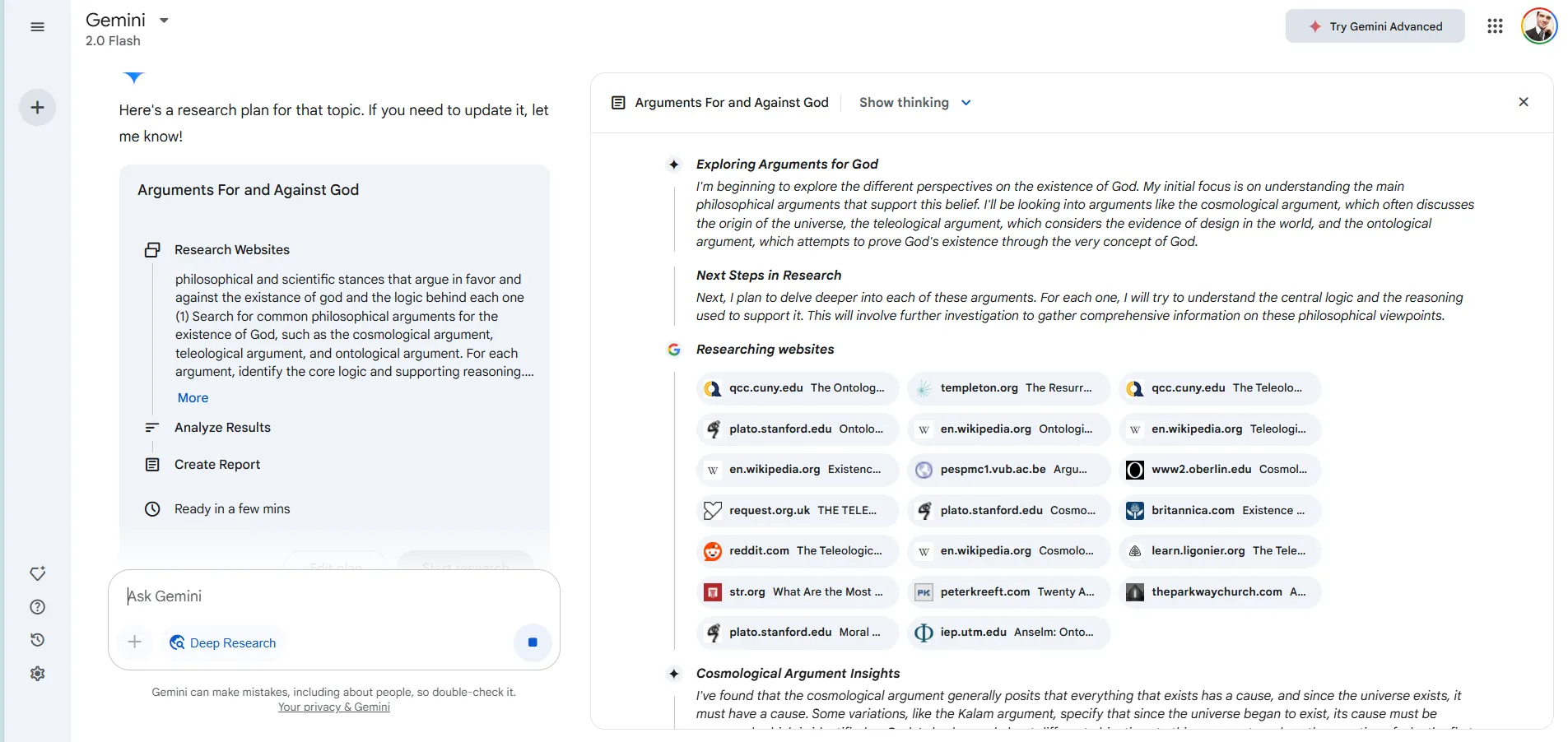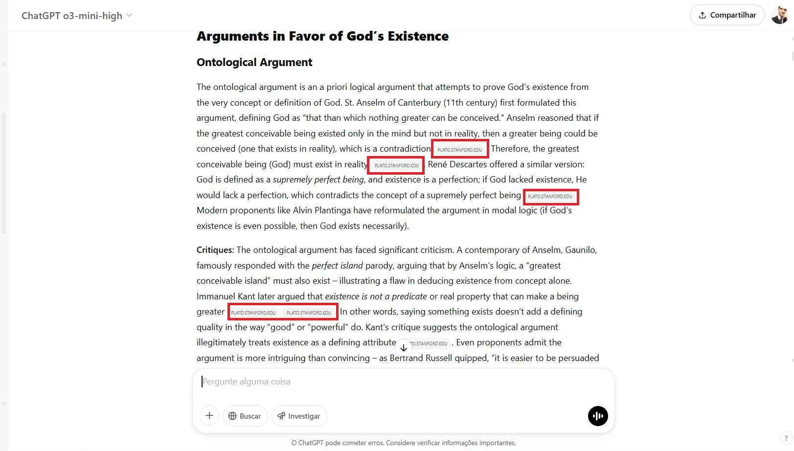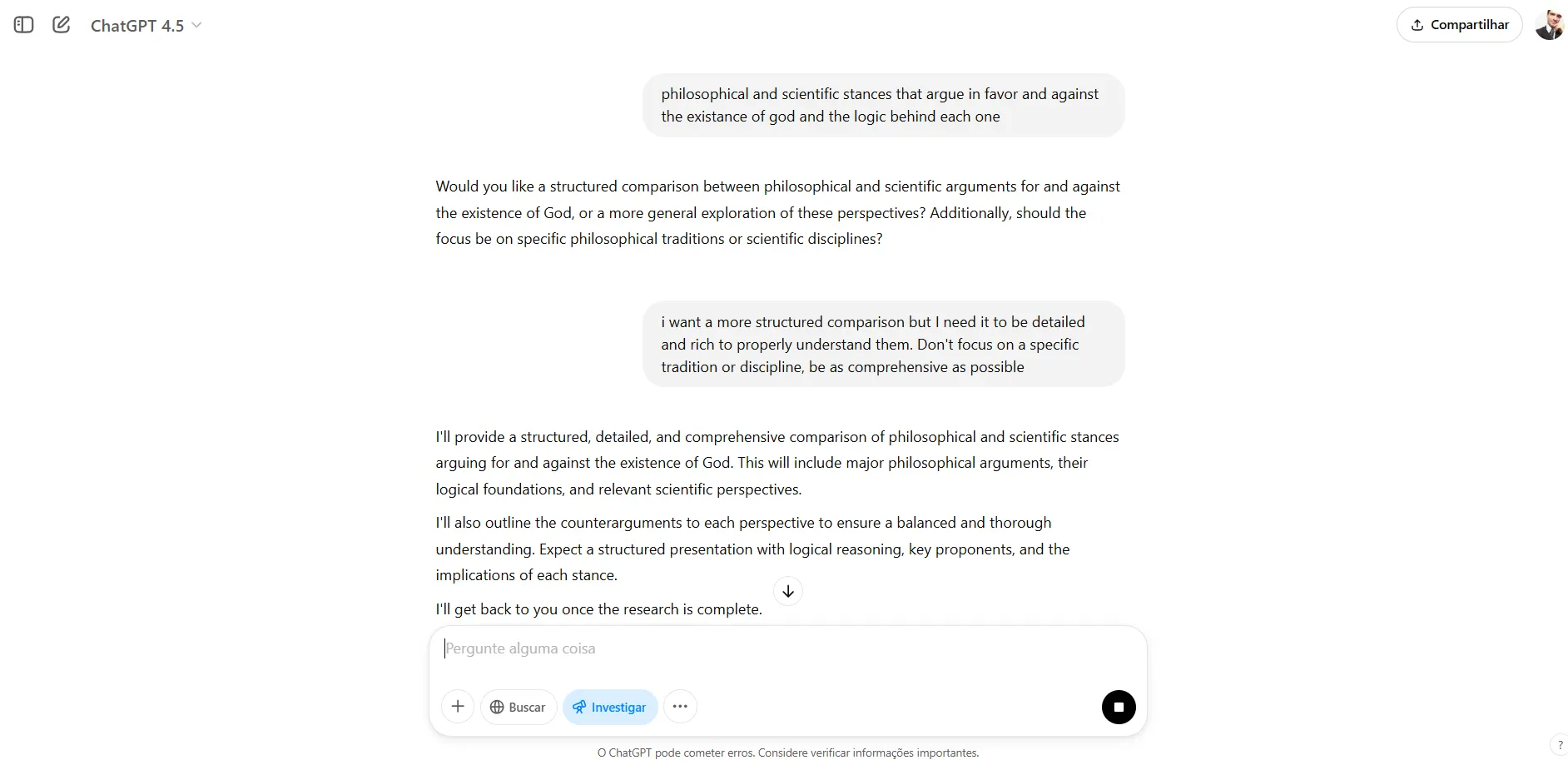 ChatGPT ofrece análisis exhaustivos que podrían pasar por investigación de nivel de posgrado—en términos de información, no metodología. Al explorar preguntas filosóficas sobre la existencia de Dios, generó un extenso análisis de 17.000 palabras que cubre distintas posiciones filosóficas con contexto histórico y contraargumentos matizados.