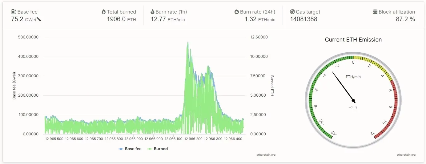 El lanzamiento de los NFT también empujó la tasa de quema a 14 ETH (40.000 dólares) por minuto, ya que la tasa de emisión de Ethereum se desplomó a -4,7 ETH por minuto.